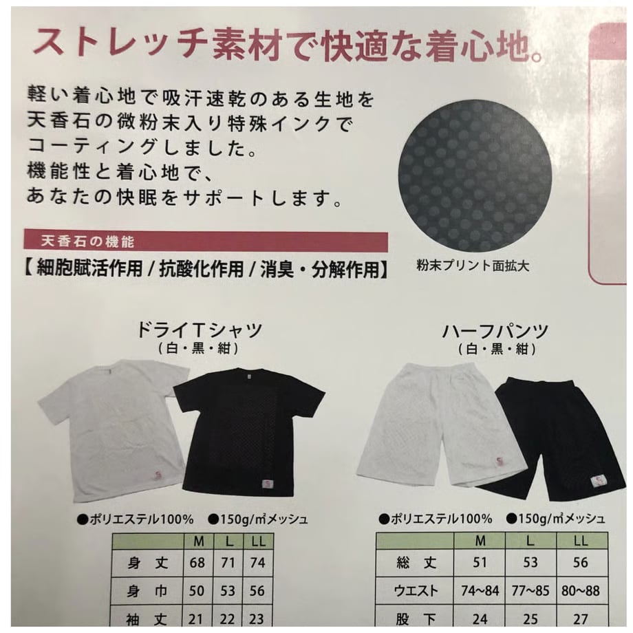 軽い着心地で吸汗速乾のある生地を天香石の微粉末入り特殊インクでコーティングしました。